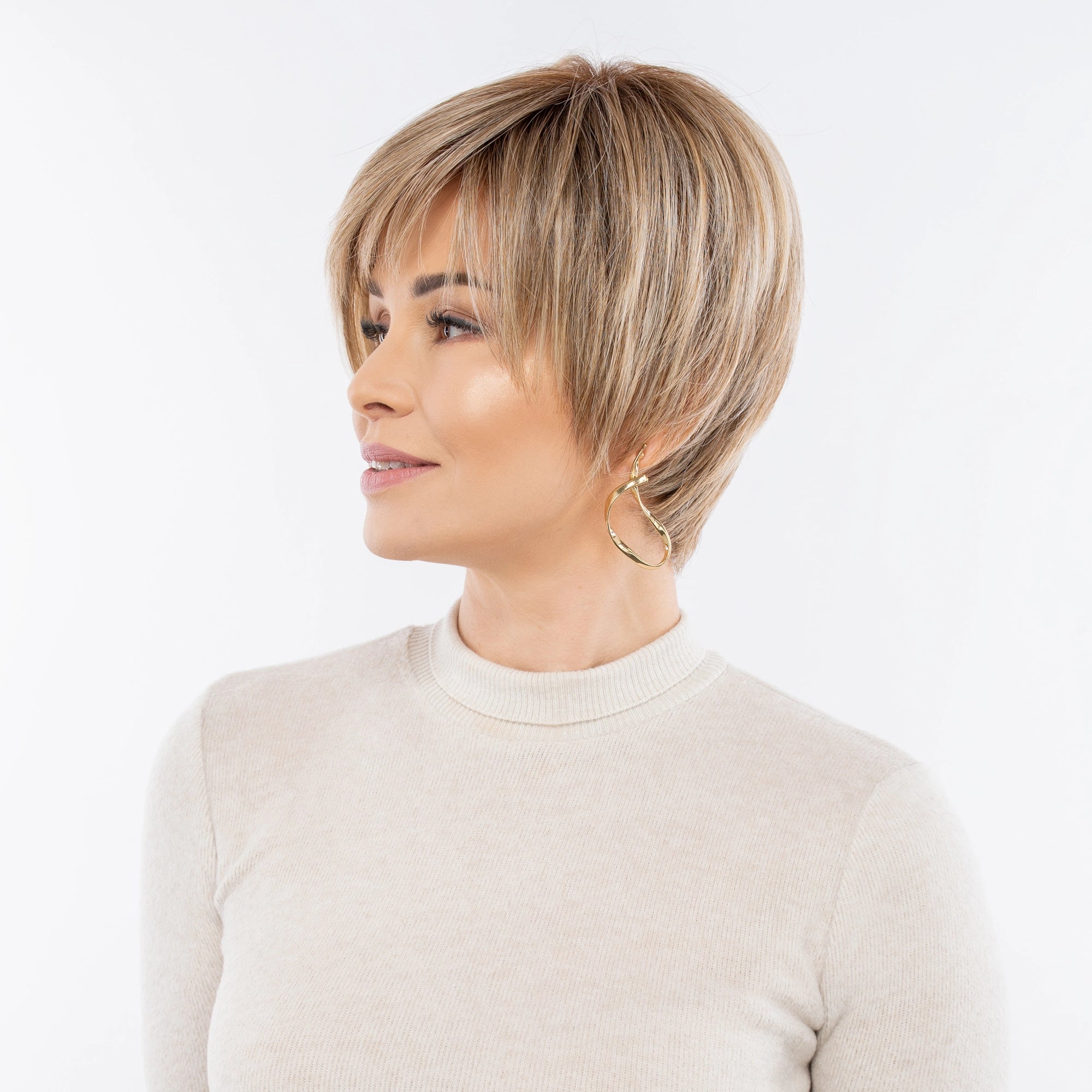 The Calypso wig is a machine-made model featuring a parting and a beautifully diffused front hairline. Made from heat-resistant synthetic fiber (up to 160°C), it allows gentle heat styling.
