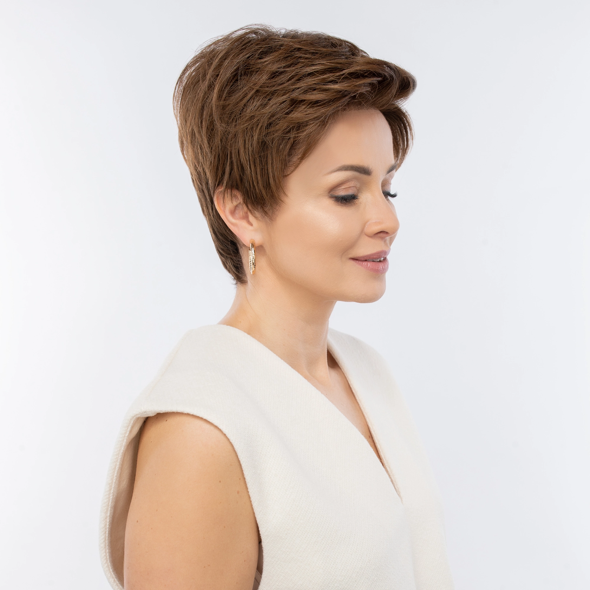 The Mira wig is a machine-made model featuring a parting and a diffused front hairline, crafted from synthetic fiber resistant to temperatures up to 160°C. The short, delicately layered cut brings lightness and sophistication, making it suitable for every type of beauty. The wig can be worn with or without a fringe, depending on personal preference.