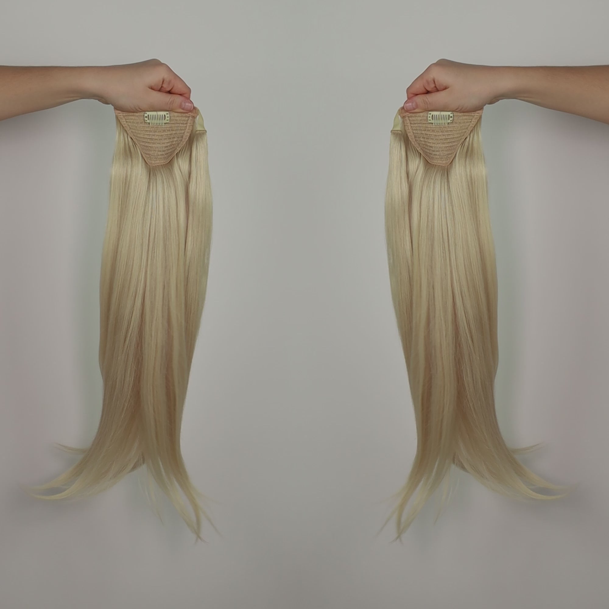 O nosso rabo de cavalo é de encaixe e tem uma mecha extra de cabelo que cai sobre o acessório, criando uma ligação discreta e natural. O rabo de cavalo parece exatamente o seu.