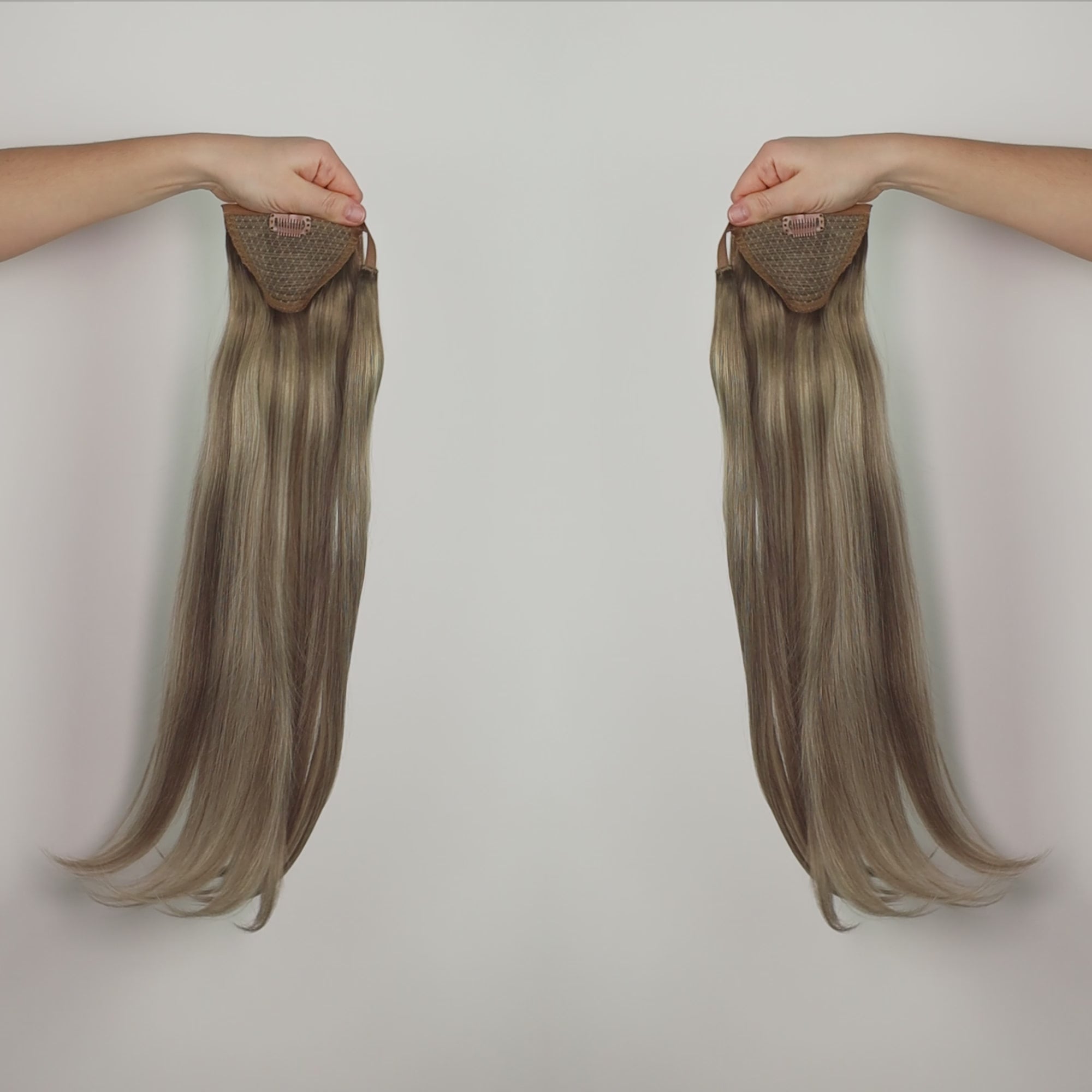 Vår hästsvans är clip-on och har en extra hårslinga som hänger över fästet och skapar en diskret och naturlig anslutning. Hästsvansen ser ut precis som din egen.